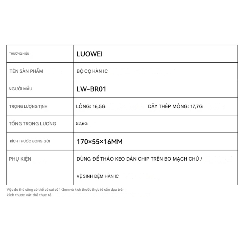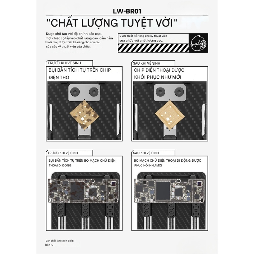 Trong lĩnh vực sửa chữa điện thoại và phần cứng điện tử, việc làm sạch keo trên chip, IC hay vệ sinh bo mạch chủ là một công đoạn đòi hỏi sự tỉ mỉ và công cụ hỗ trợ chuyên dụng. Bộ sản phẩm mới đến từ thương hiệu Luowei đang nhận được sự quan tâm lớn nhờ thiết kế thông minh và hiệu năng vượt trội. Đó chính là Chổi vệ sinh Luowei LW-BR01.