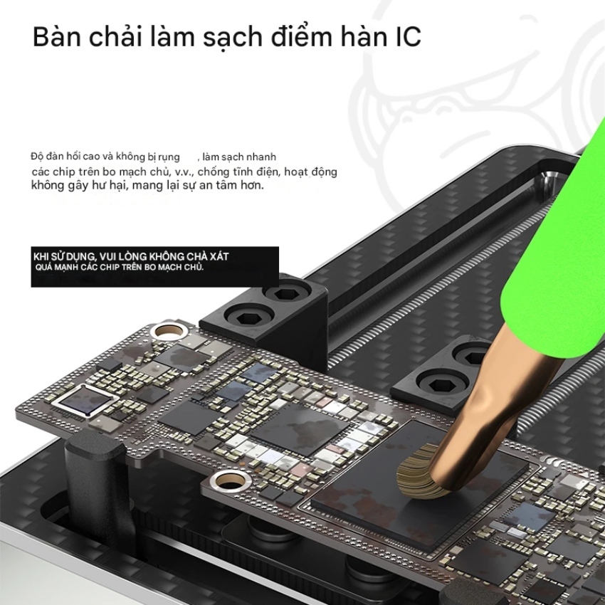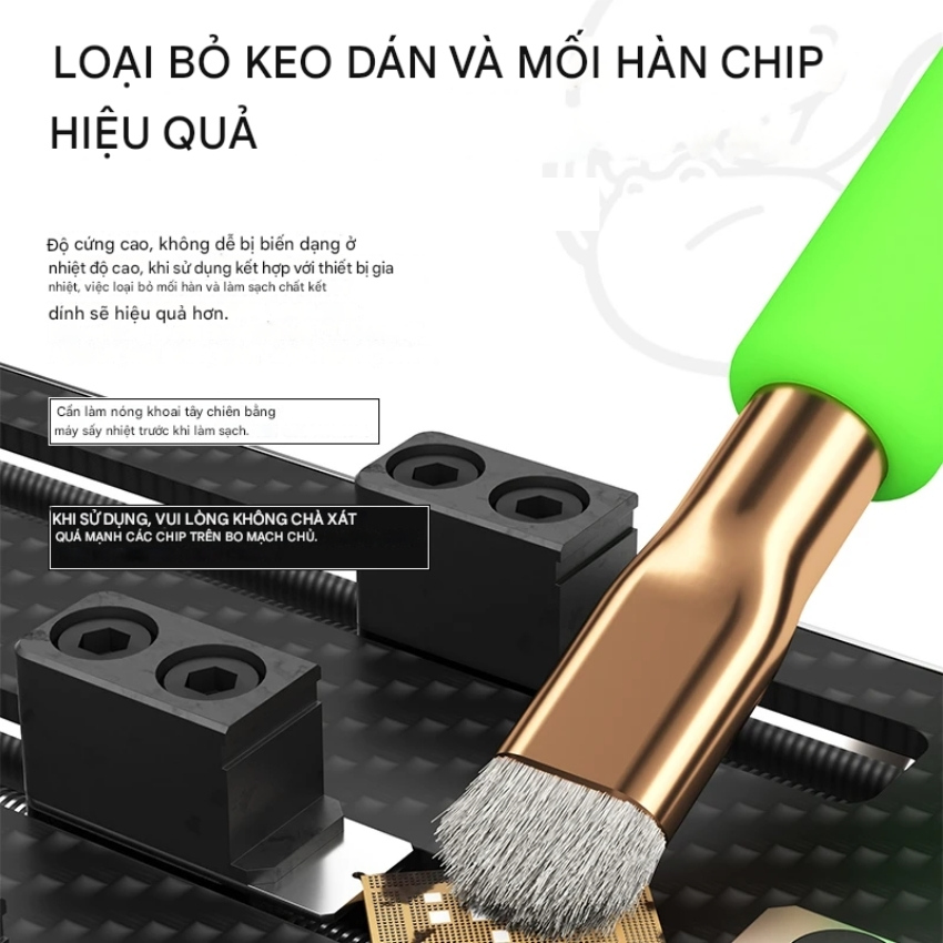 Công dụng: Dùng để vệ sinh bụi bẩn, làm sạch tinh sau khi đã cạo keo thô. Đầu chổi này giúp làm sạch các chân IC (Pad) mà không gây trầy xước hay hư hỏng bo mạch, mang lại sự an tâm tuyệt đối khi thao tác.
