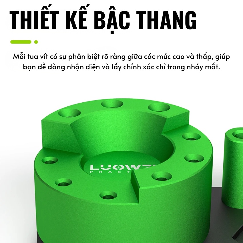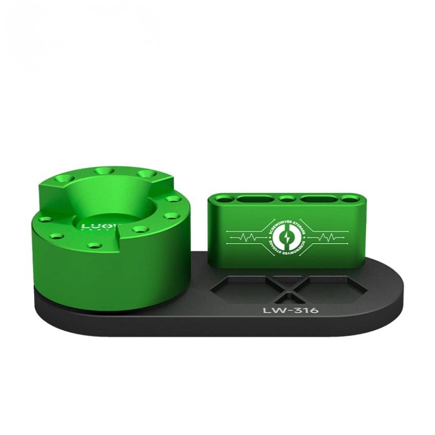 Điểm nhấn đầu tiên của kệ lưu trữ tua vít Luowei chính là độ hoàn thiện cực tốt. Sản phẩm được gia công từ Hợp kim nhôm kim loại mang lại độ bền bỉ, cứng cáp nhưng vẫn duy trì được kích thước nhỏ gọn (Small Size). Sự kết hợp giữa màu xanh lá nổi bật và bệ đỡ màu đen tạo nên vẻ ngoài chuyên nghiệp cho không gian làm việc.