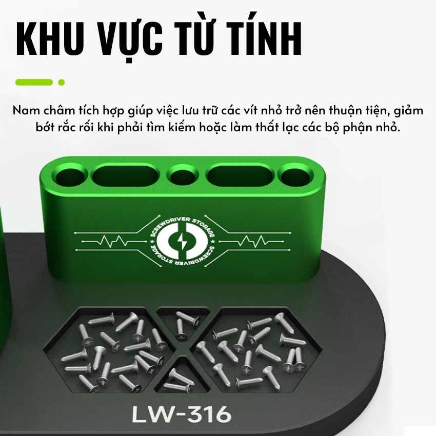 Thất lạc những con ốc siêu nhỏ luôn là “cơn ác mộng” đối với thợ sửa chữa. Hiểu được điều đó, nhà sản xuất đã tích hợp Khu vực từ tính ở phần đế của sản phẩm. Với các nam châm được tích hợp ngầm bên dưới khay chứa hình lục giác, bạn có thể yên tâm đặt các loại ốc vít nhỏ vào đây mà không sợ rơi rớt hay thất lạc, giảm thiểu đáng kể những rắc rối không đáng có.