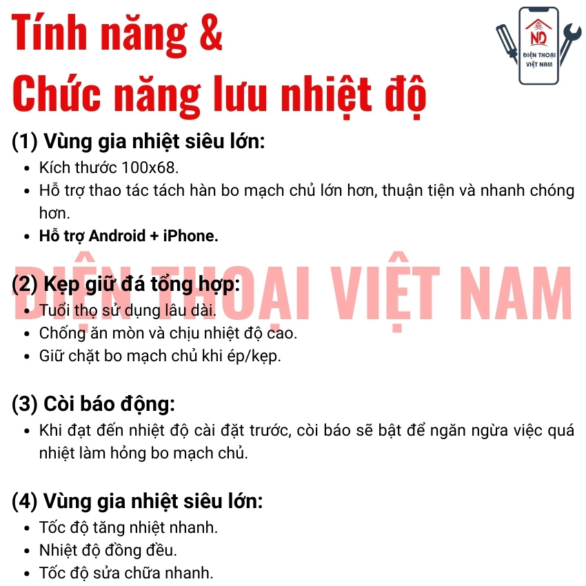 Khu vực sưởi ấm cực lớn, hỗ trợ cho điện thoại. Android, khu vực hoạt động lớn, khả năng tương thích tốt.