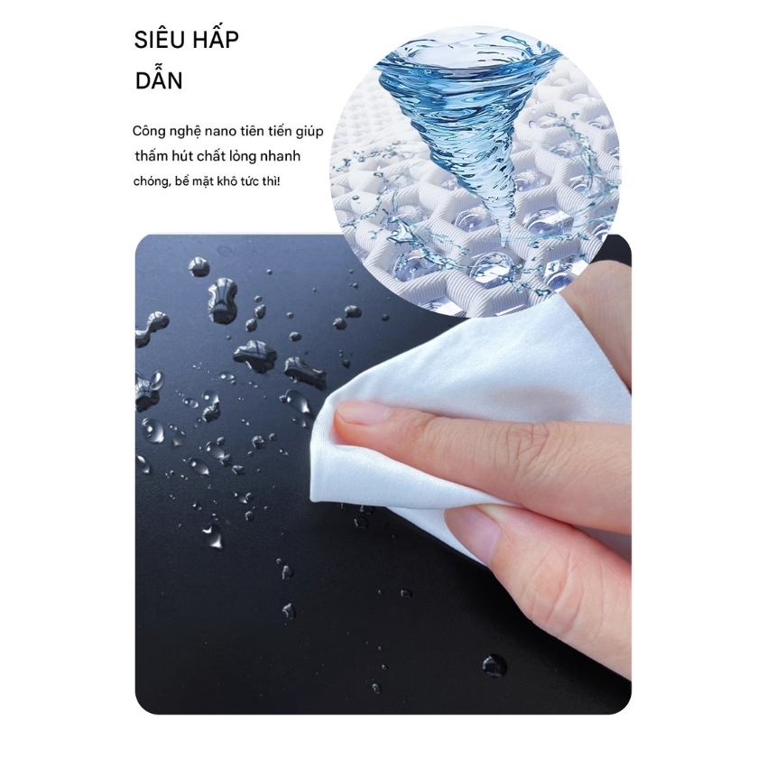 Khô ráo tức thì: Khi lau bề mặt ướt, khăn sẽ hút sạch nước và dung môi, trả lại bề mặt khô ráo ngay lập tức mà không để lại vệt nước loang lổ.