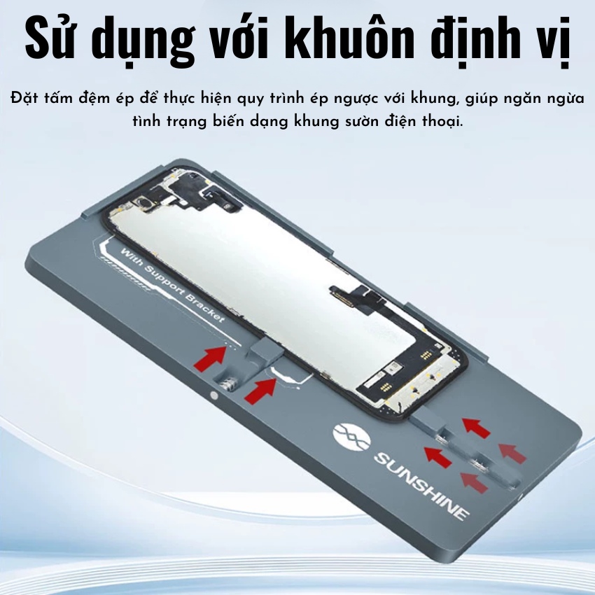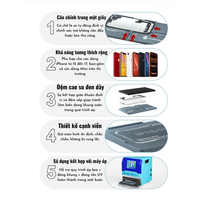 Nếu bạn đang tìm kiếm một công cụ để nâng cấp chất lượng dịch vụ ép kính iPhone đời cao, Khuôn ép kính liền ron Sunshine SS-061A là một khoản đầu tư cực kỳ xứng đáng. Không chỉ dừng lại ở việc định vị nhanh, Spring Alignment Laminating Mold còn bảo vệ tối đa linh kiện khách hàng, mang lại sự an tâm tuyệt đối trong quá trình thao tác.