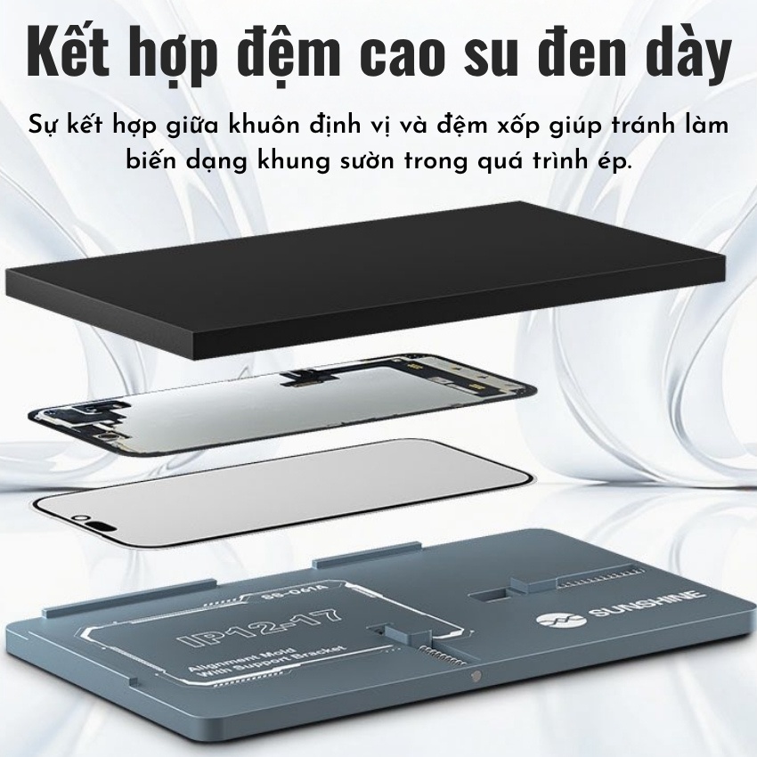 Một nỗi lo lớn của kỹ thuật viên khi ép kính là làm biến dạng khung ron hoặc vỡ màn hình do áp lực không đều. Khuôn ép kính liền ron Sunshine SS-061A đi kèm với một tấm đệm cao su đen (Black Glue Pad) dày dặn.