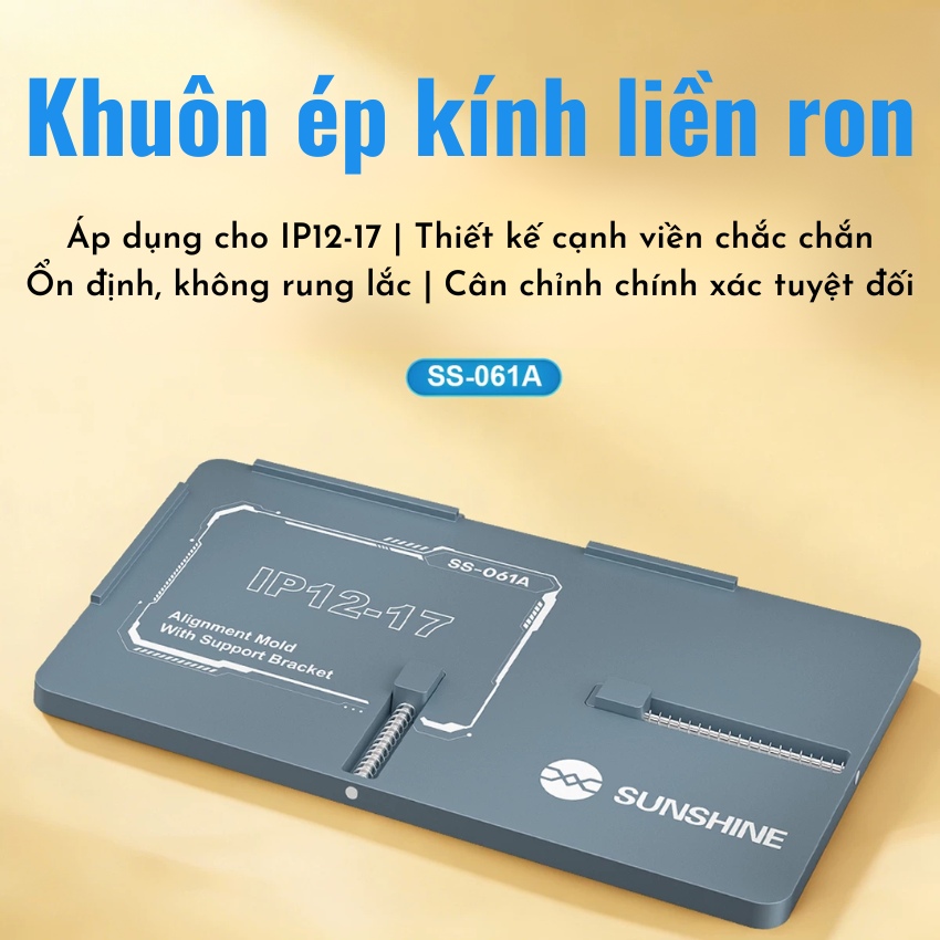 Trong thế giới sửa chữa điện thoại chuyên nghiệp, việc ép kính chính xác đến từng milimet là yếu tố sống còn để đảm bảo chất lượng hiển thị và thẩm mỹ. Khuôn ép kính liền ron Sunshine SS-061A (Spring Alignment Laminating Mold) chính là “trợ thủ đắc lực” mới nhất, giúp tối ưu hóa quy trình thay mặt kính cho các dòng iPhone đời cao.