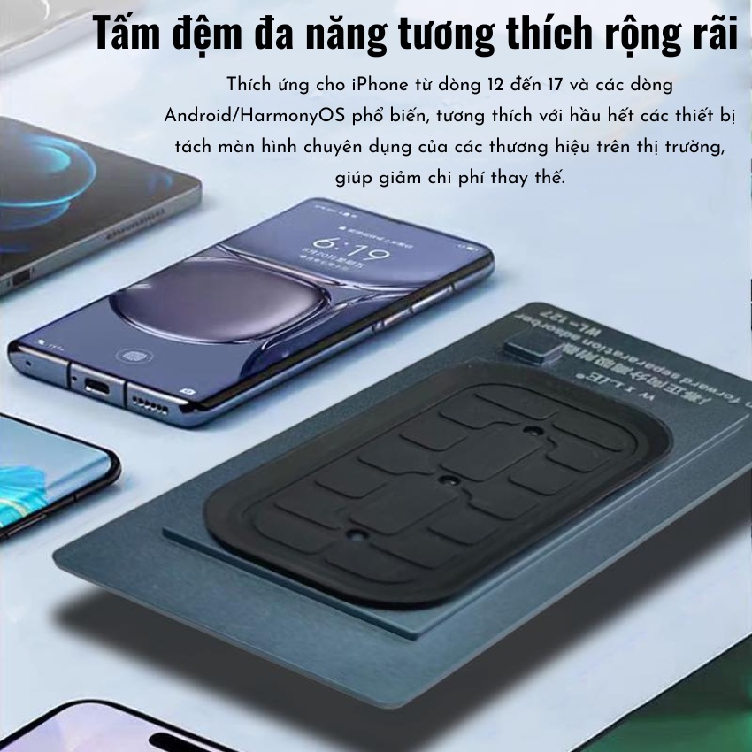 Màn hình Phẳng & Cong: Nhờ lớp silicone linh hoạt, Khuôn tách kính màn hình giữ ron Wylie WL-127 có thể bám dính chắc chắn lên cả các bề mặt cong nhẹ, một tính năng mà không phải loại khuôn nào cũng làm được.