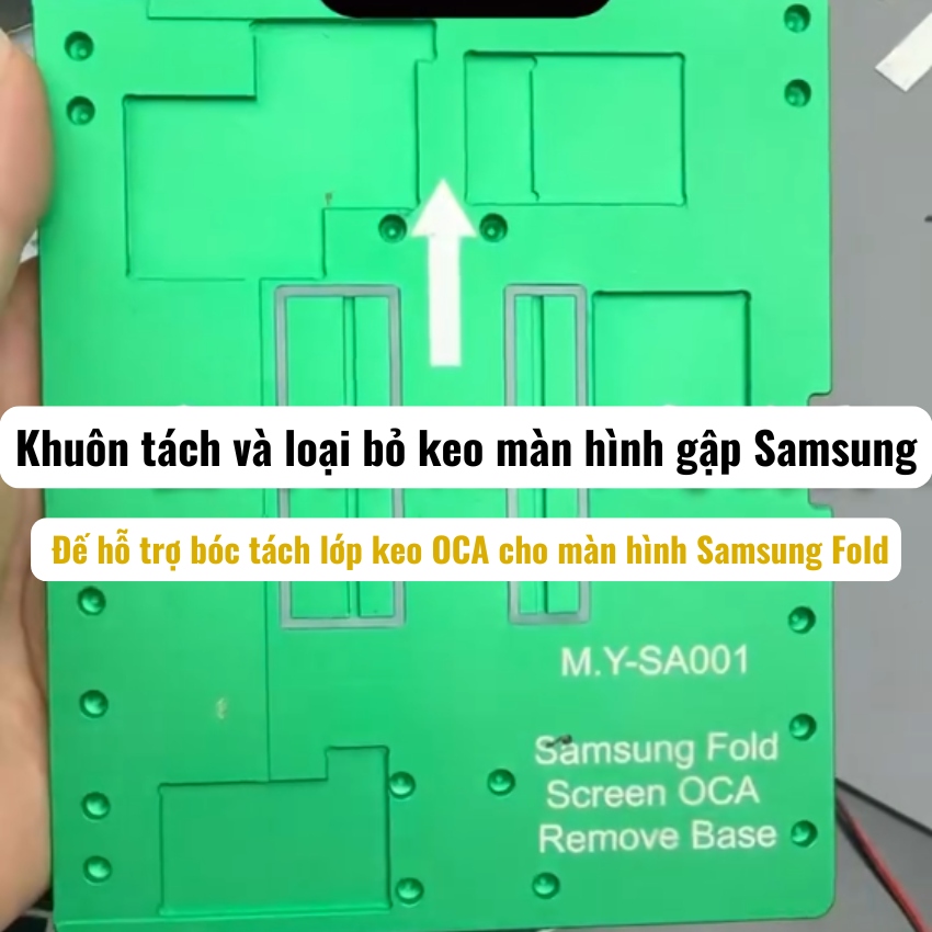 Sản phẩm M.Y-SA001 là bộ khuôn chuyên dụng được thiết kế riêng biệt cho dòng Samsung Fold. Với độ chính xác cơ khí cao, khuôn giúp cố định màn hình gập một cách chắc chắn trong quá trình xử lý lớp keo OCA và tách kính.