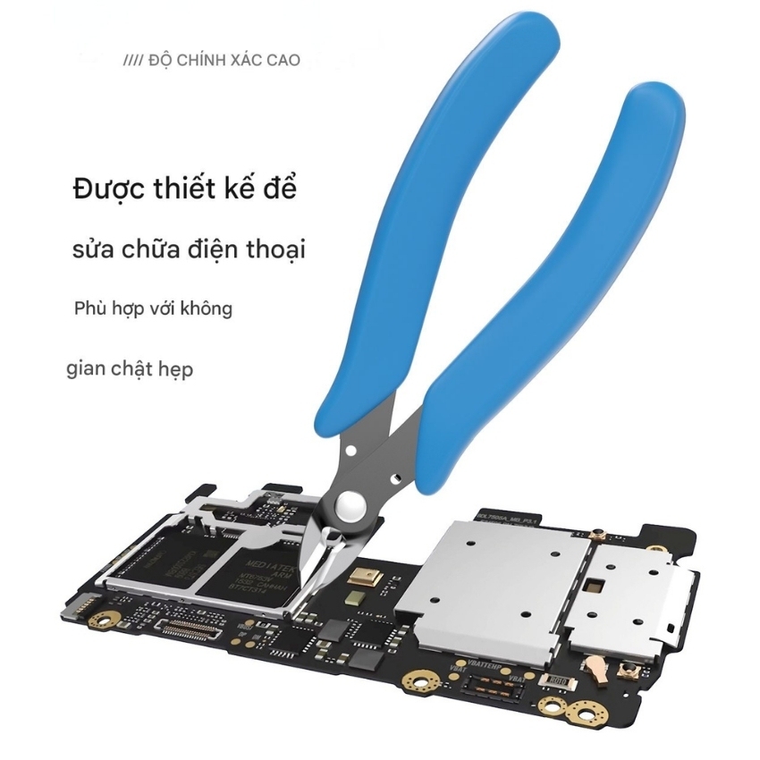 Thiết kế chuyên dụng: Mũi kìm nhỏ gọn, vát chéo tinh xảo, cho phép kỹ thuật viên dễ dàng luồn lách và cắt sát các chân linh kiện trong không gian hẹp của bo mạch.