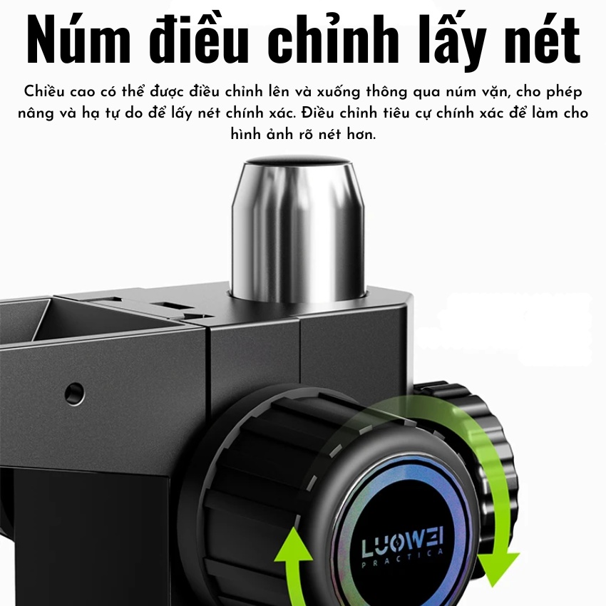 Trang bị đế hợp kim vững chắc, đèn LED chiếu sáng mạnh và cụm chỉnh tiêu cự mượt mà, dễ điều chỉnh.