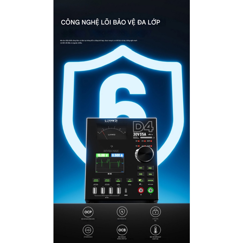 An toàn là yếu tố sống còn đối với một bộ nguồn đa năng. Máy cấp nguồn Luowei D4 được trang bị hệ thống bảo vệ lõi 6 lớp bao gồm: