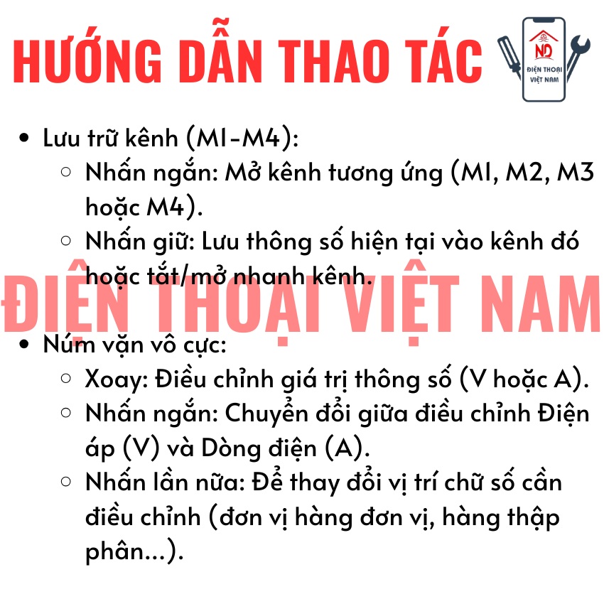 4 Kênh nhớ lưu trữ (M1 – M4): Tính năng này cho phép lưu lại 4 thiết lập Điện áp/Dòng điện thường dùng. Kỹ thuật viên có thể gọi lại thông số chỉ bằng một phím bấm, tiết kiệm thời gian điều chỉnh khi chuyển đổi giữa sửa chữa iPhone, Android hay Laptop.