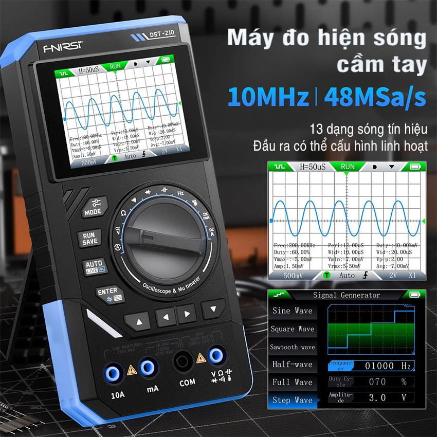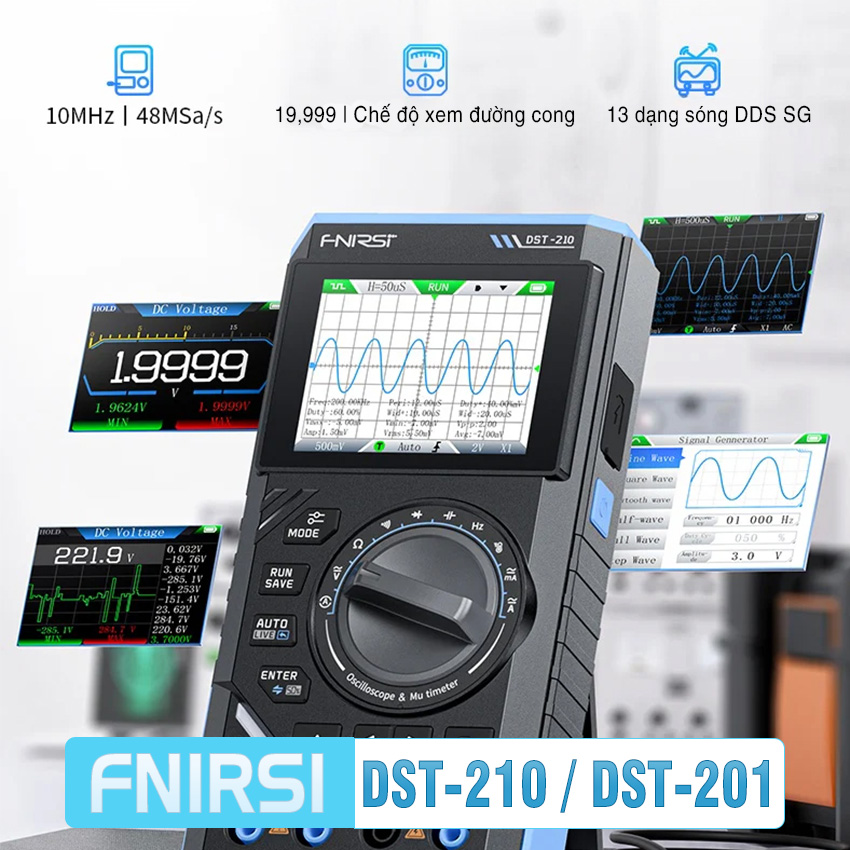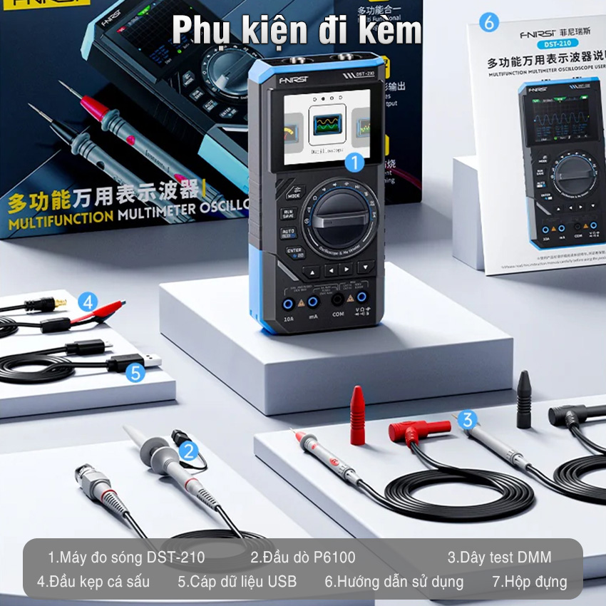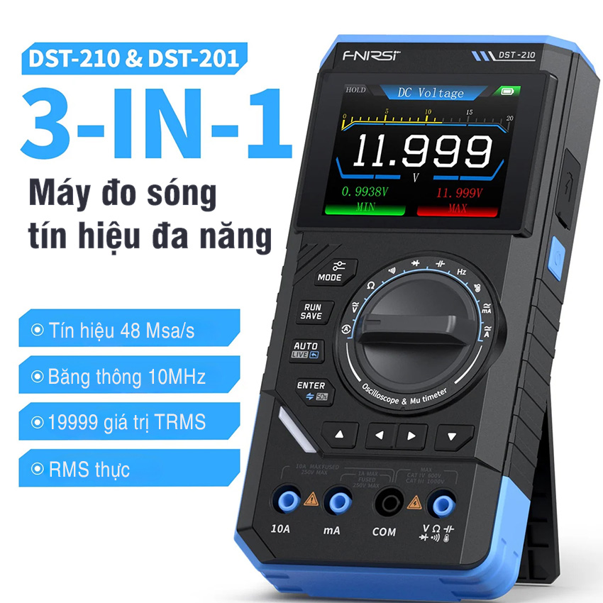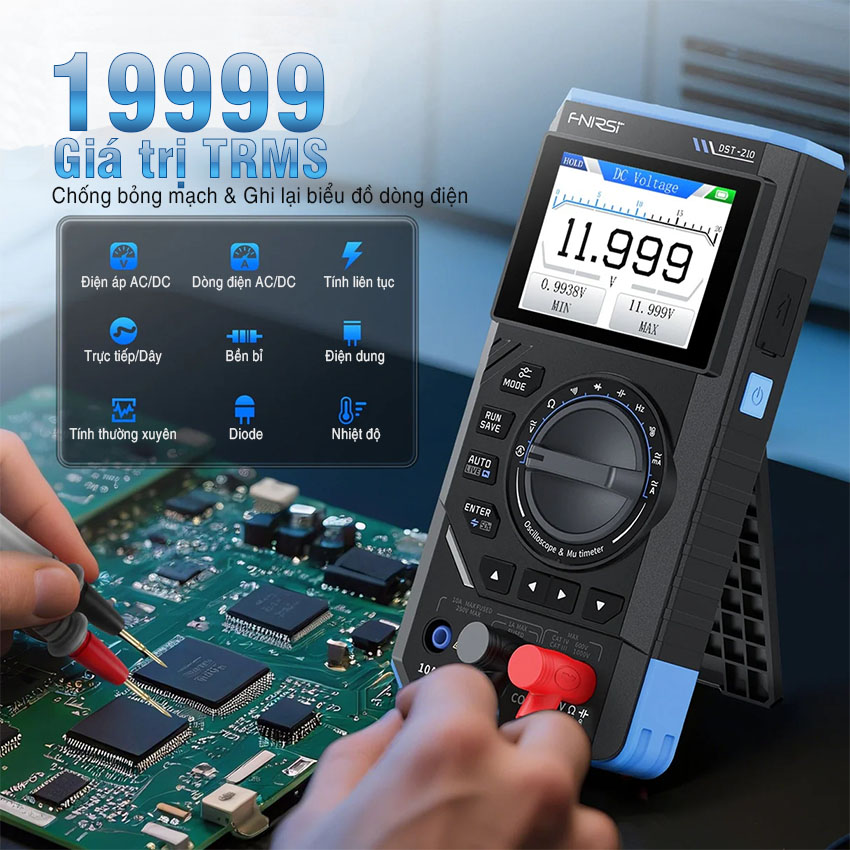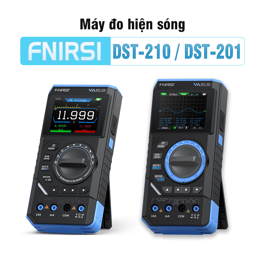 Máy đo hiện sóng FNIRSI DST-210 / DST-201 3-in-1 – oscilloscope + multimeter + signal generator cầm tay, màn hình màu 2.8″, pin 3000mAh, phù hợp sửa chữa điện tử, học tập & bảo trì.