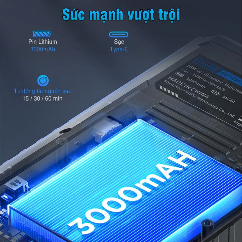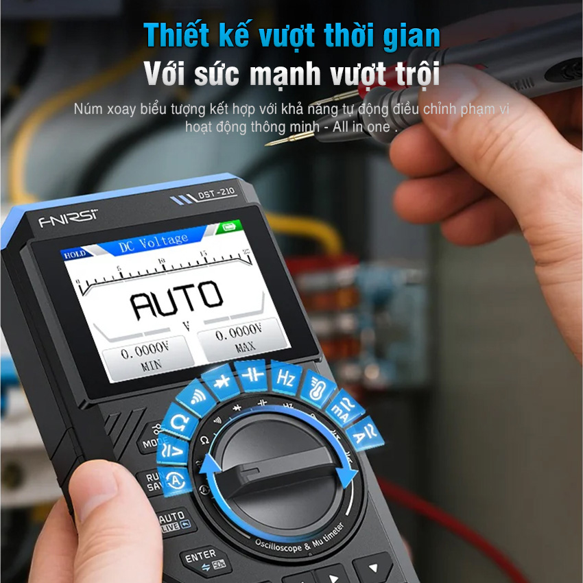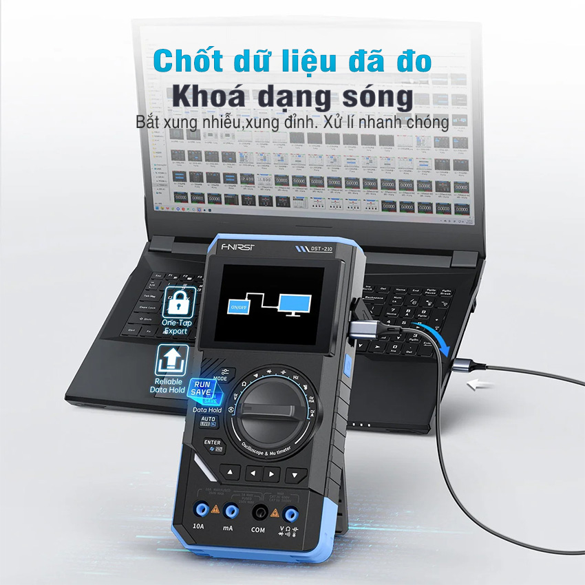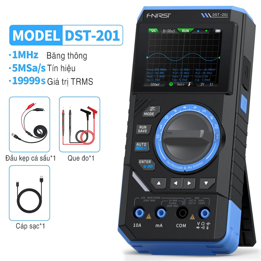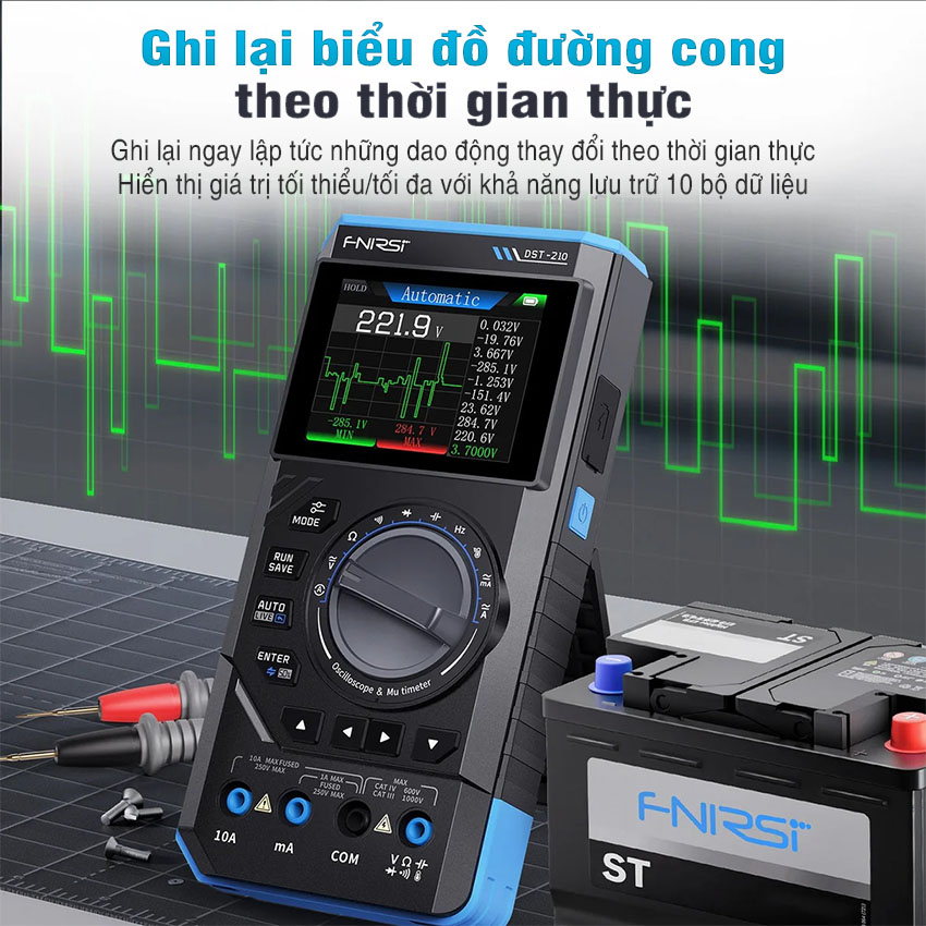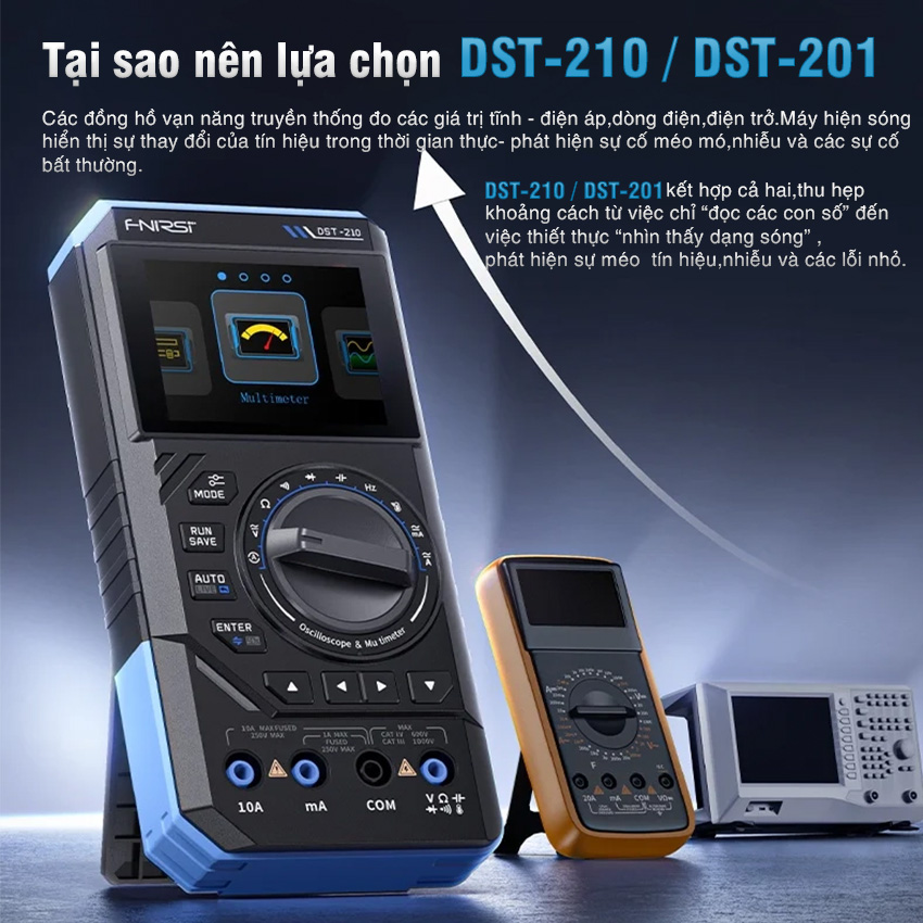 Máy đo hiện sóng FNIRSI DST-210 / DST-201 3-in-1 – oscilloscope + multimeter + signal generator cầm tay, màn hình màu 2.8″, pin 3000mAh, phù hợp sửa chữa điện tử, học tập & bảo trì.