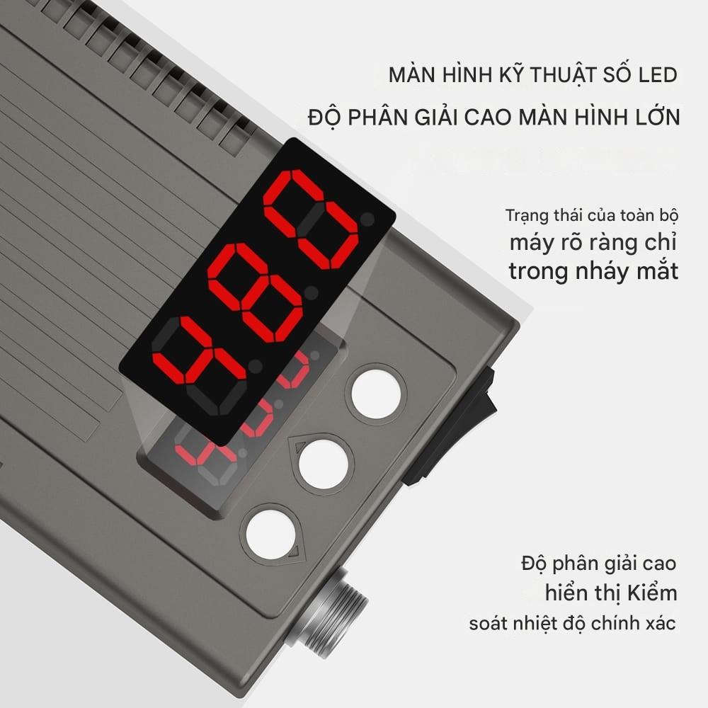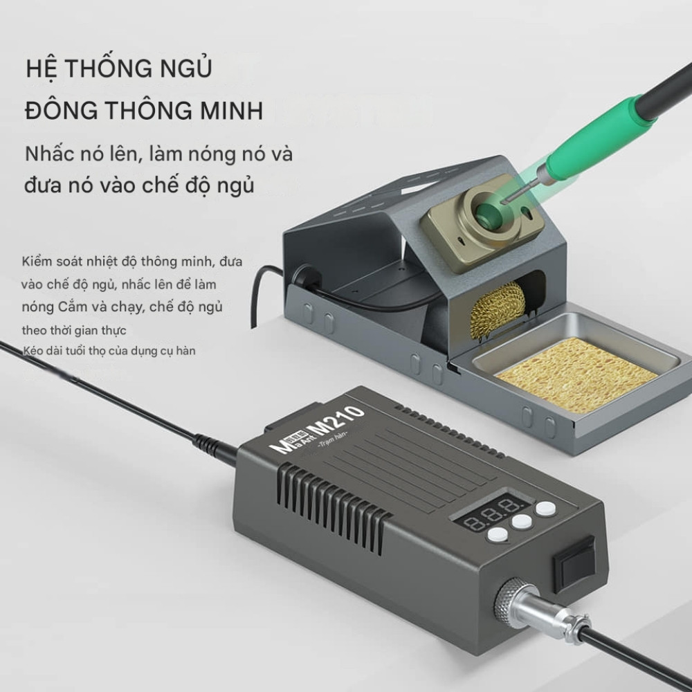 Máy hàn điện tử MaAnt M210 có tốc độ làm nóng chỉ trong 3 giây, thiếc tan chảy sau 2 giây, giúp công việc hàn diễn ra nhanh chóng, ổn định. Màn hình LED kỹ thuật số hiển thị rõ ràng nhiệt độ, dễ dàng theo dõi và điều chỉnh. Ngoài ra, trạm hàn này còn tích hợp chế độ ngủ thông minh, tự động hạ nhiệt khi không sử dụng, tiết kiệm điện năng và tăng tuổi thọ.