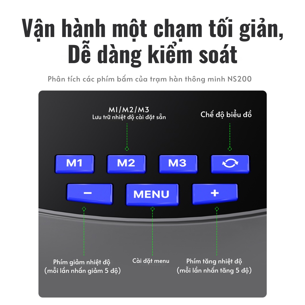 3 Phím bộ nhớ (M1, M2, M3): Cho phép lưu trữ 3 mức nhiệt độ thường dùng (ví dụ: $350^{\circ}C$, $400^{\circ}C$, $450^{\circ}C$), giúp chuyển đổi chỉ bằng một cú nhấp.