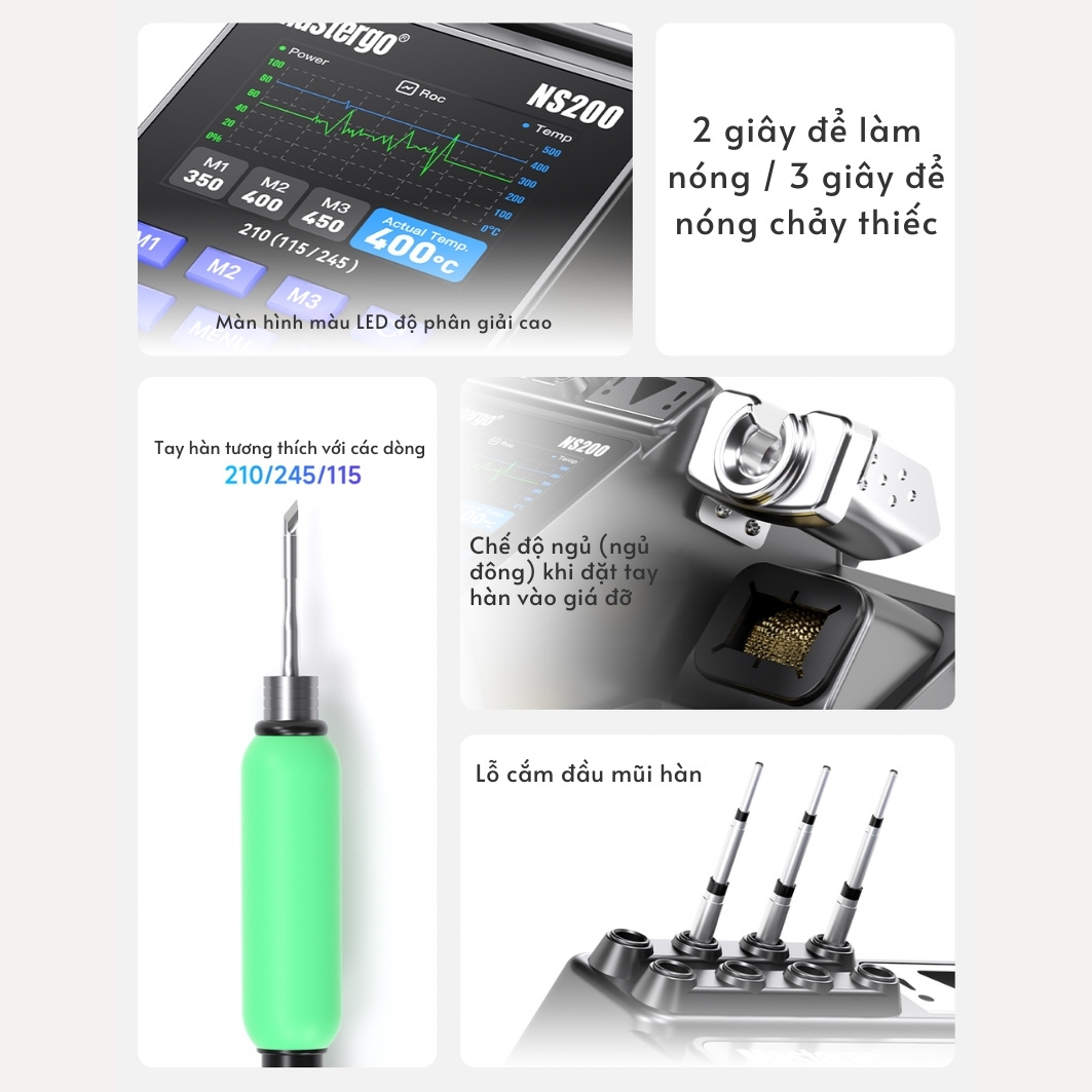 Điểm đáng kinh ngạc nhất của Soldering Station NS200 chính là hiệu suất nhiệt. Nhờ hệ thống kiểm soát nhiệt thông minh và công suất lên đến 200W: