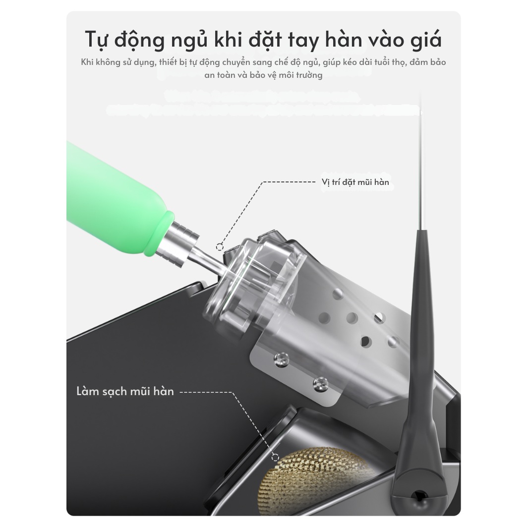 Chế độ ngủ tự động (Hibernation): Khi đặt tay hàn vào giá đỡ, máy sẽ tự động vào trạng thái ngủ để kéo dài tuổi thọ mũi hàn và đảm bảo an toàn.
