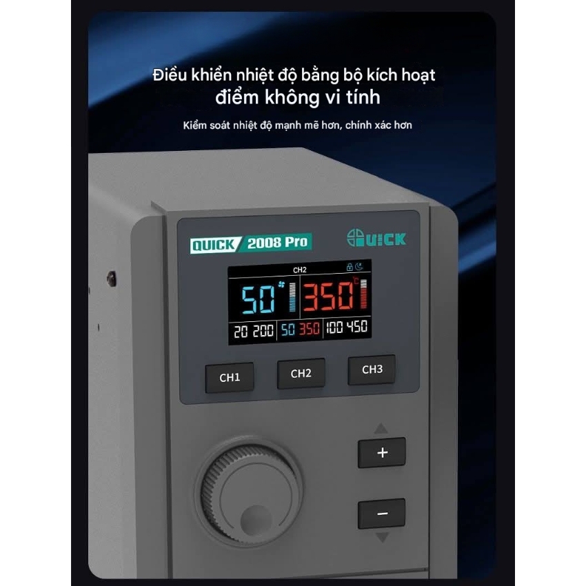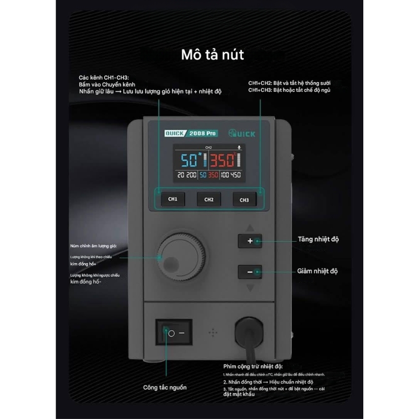 3 Kênh nhớ (CH1, CH2, CH3): Nhấn nhanh để chuyển đổi kênh, nhấn giữ để lưu nhiệt độ và lượng gió hiện tại vào bộ nhớ. Điều này cực kỳ tiện lợi khi bạn cần chuyển đổi nhanh giữa khò IC, khò tụ hay làm sạch keo.