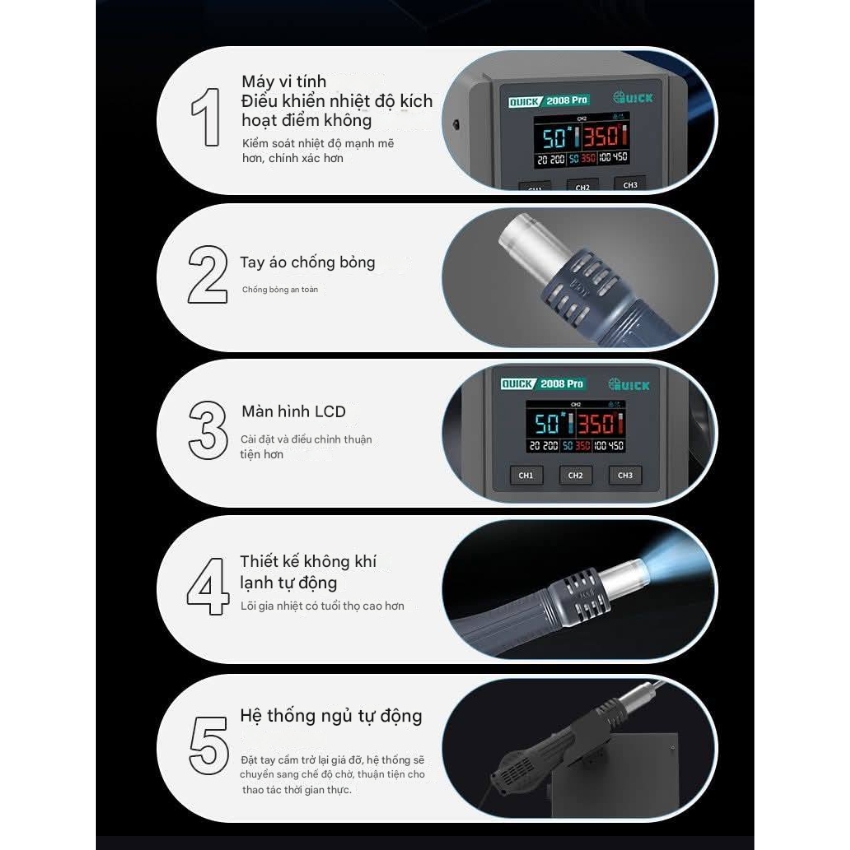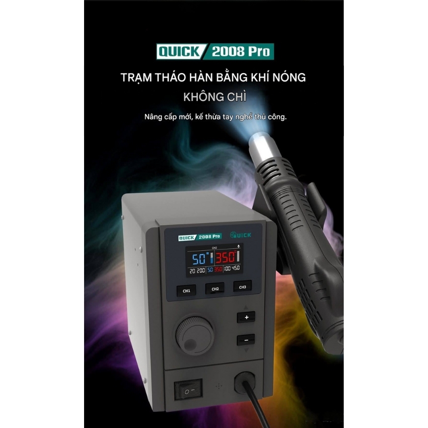 Trong lĩnh vực sửa chữa điện tử phần cứng, thương hiệu QUICK đã trở thành cái tên bảo chứng cho chất lượng và độ bền. Tiếp nối thành công của các phiên bản trước, sự hợp tác giữa QUICK và SUNSHINE đã cho ra đời phiên bản nâng cấp toàn diện. Mang tên Máy khò Quick 2008 Pro, đây là dòng máy khò nhiệt không chì, được tích hợp nhiều công nghệ hiện đại. Nhằm tối ưu hóa hiệu suất làm việc cho các kỹ thuật viên chuyên nghiệp.
