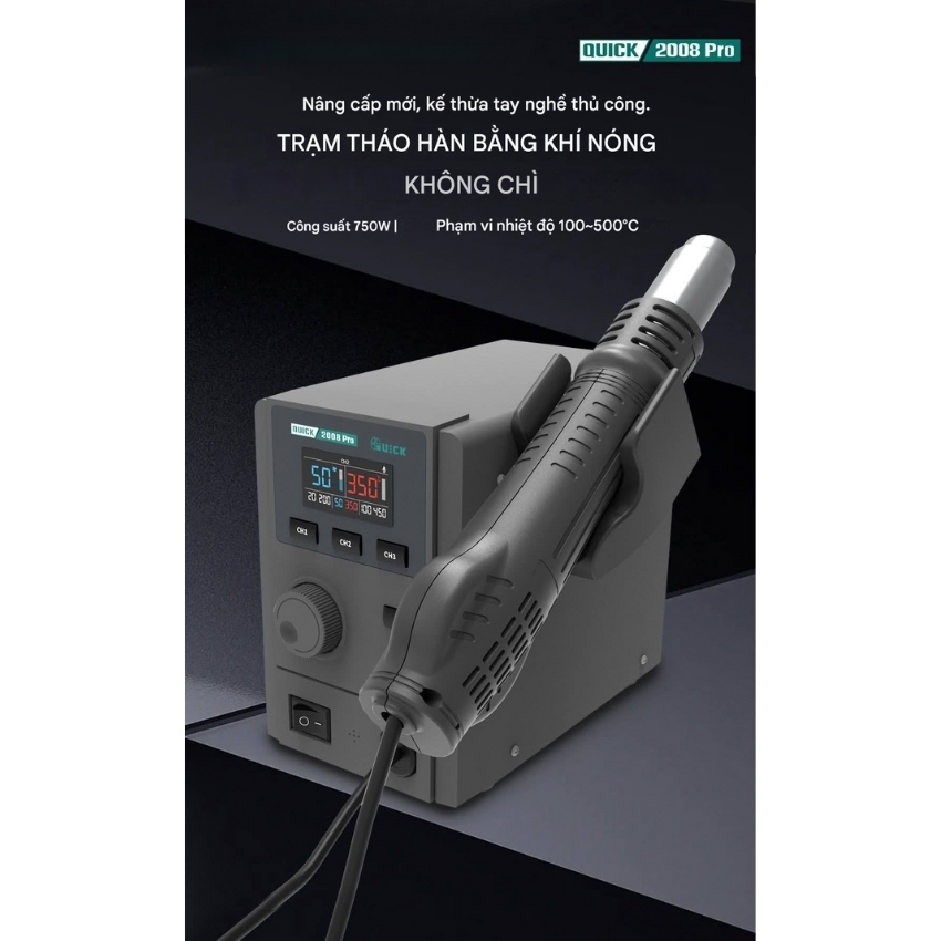 Với công suất mạnh mẽ 750W, khả năng kiểm soát nhiệt chính xác và độ bền cao. Quick 2008 Pro thực sự là một bản nâng cấp đáng giá. Nếu bạn đang tìm kiếm một thiết bị khò hàn vừa hiện đại, vừa bền bỉ để phục vụ công việc sửa chữa chuyên sâu. Việc đầu tư một chiếc Máy khò Quick 2008 Pro là sự lựa chọn hoàn toàn chính xác.