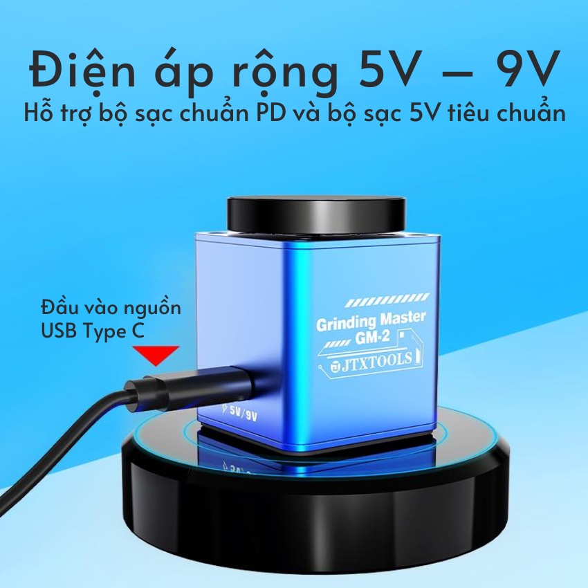 Một điểm cộng lớn cho Máy mài JTX GM-2 là khả năng hỗ trợ dải điện áp rộng từ 5V đến 9V. Máy sử dụng cổng cấp nguồn USB Type-C phổ biến, cho phép bạn sử dụng chung với củ sạc điện thoại, sạc dự phòng hoặc cổng USB máy tính. Việc hỗ trợ các bộ sạc chuẩn PD (Power Delivery) giúp máy hoạt động ổn định và đạt hiệu suất cao nhất.