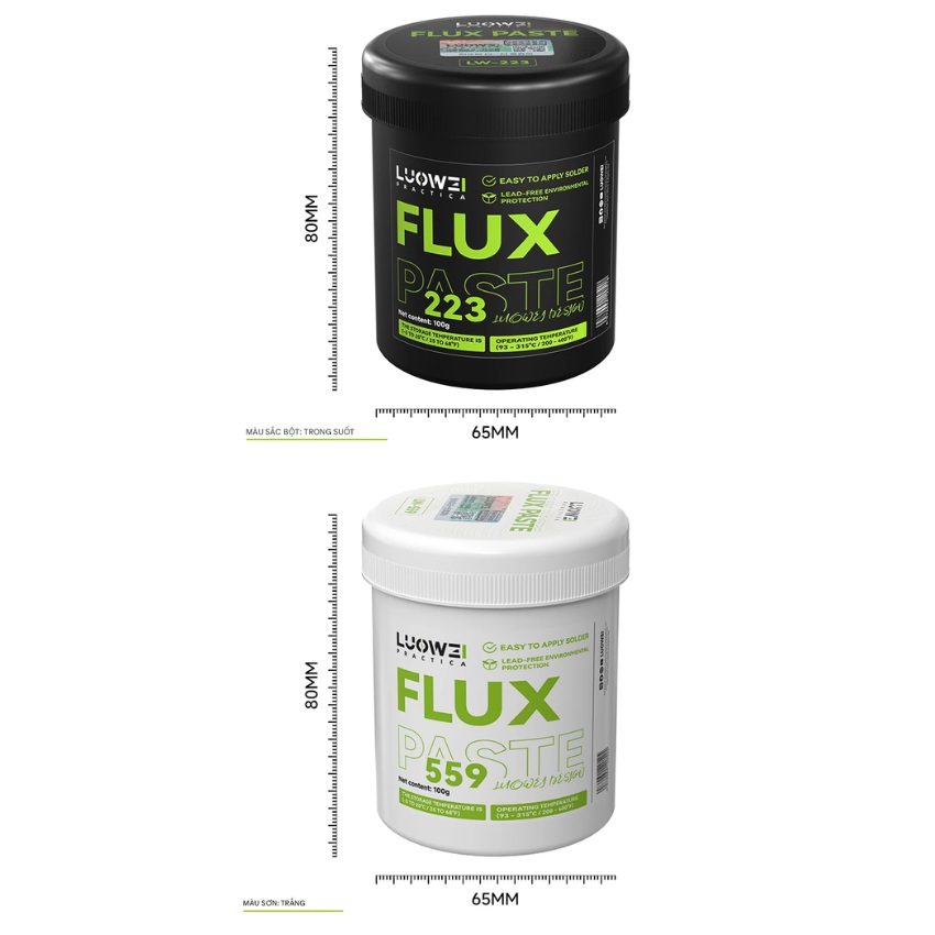 Tiện lợi và không cần tẩy rửa: Cả Mỡ hàn Luowei LW-223Mỡ hàn Luowei LW-559 đều thuộc dòng “No-clean”, không để lại dư lượng gây hại, giúp tiết kiệm thời gian vệ sinh sau khi hàn.