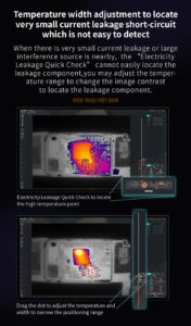 Kiểm tra nhanh rò rỉ điện là xác định nhanh nhiệt độ bất thường theo nhiệt độ thời gian thực. Bằng cách điều chỉnh phạm vi nhiệt độ để khắc phục sự cố một cách chi tiết.