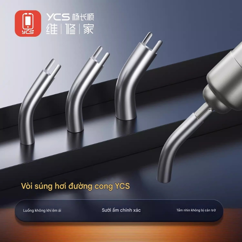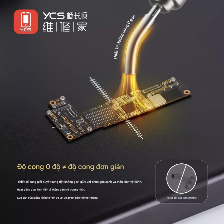 Trong quá trình hàn khò linh kiện điện tử, đặc biệt là khi thao tác dưới kính hiển vi, việc đầu khò thẳng che khuất tầm nhìn là trở ngại lớn. Để giải quyết vấn đề này, bộ sản phẩm Đầu khò cong YCS đã ra đời với thiết kế đường cong khí động học thông minh, giúp luồng nhiệt chính xác mà không làm cản trở tầm mắt của người thợ.