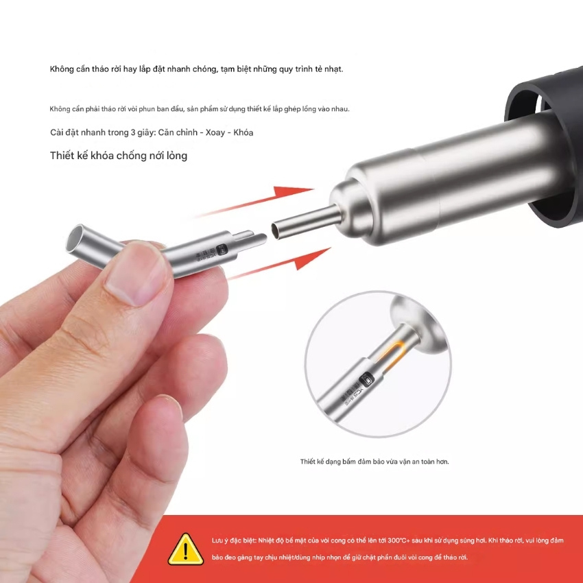 YCS đã tối ưu hóa trải nghiệm người dùng bằng cơ chế ngàm cài thông minh (Buckle design). Bạn không cần phải tháo ốc hay dùng tuốc nơ vít phức tạp. Quy trình lắp đặt chỉ tốn 3 giây với 3 bước: Đối xứng -> Xoay -> Cài chặt. Cơ chế này giúp đầu khò bám chắc vào tay khò, không bị lỏng lẻo hay tuột ra trong quá trình làm việc ở nhiệt độ cao.