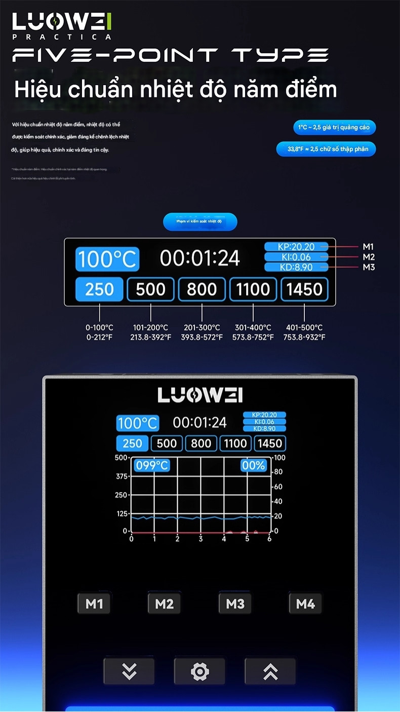 Trang bị màn hình LCD hiển thị nhiệt độ và chế độ làm việc, hỗ trợ điều chỉnh linh hoạt cho từng yêu cầu kỹ thuật.