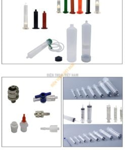 Hình dạng gồm một ống kim thép không rỉ và đầu phểu nhựa có vành kép để gắn vào ống pit-tông.