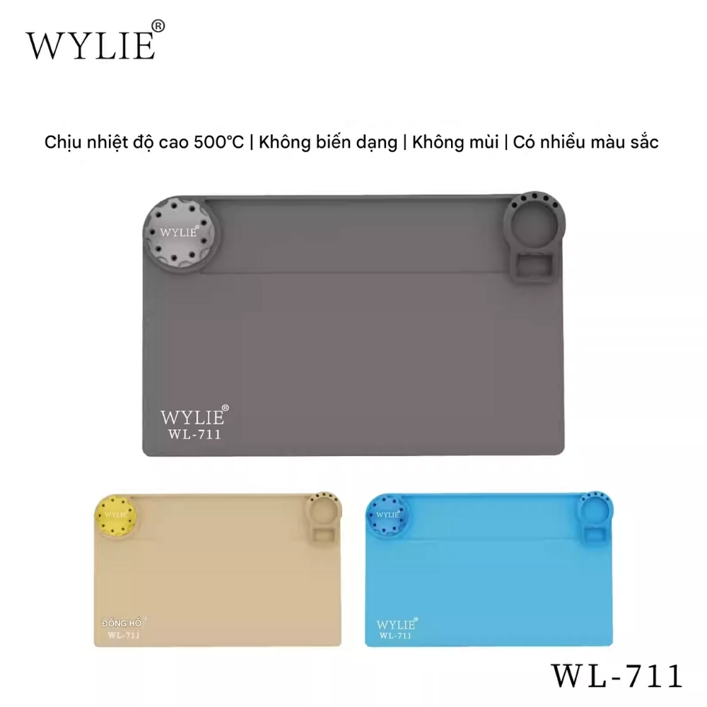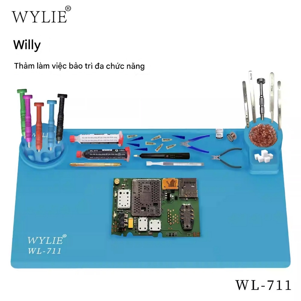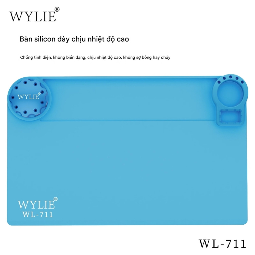 Thảm lót kỹ thuật Wylie WL-711 là phụ kiện không thể thiếu cho thợ sửa điện thoại và các kỹ thuật viên điện tử. Được làm từ silicone cao cấp, sản phẩm có khả năng chịu nhiệt cao, chống cháy, chống mài mòn và hạn chế trượt hiệu quả, giúp bảo vệ bề mặt bàn trong quá trình thao tác hàn linh kiện.