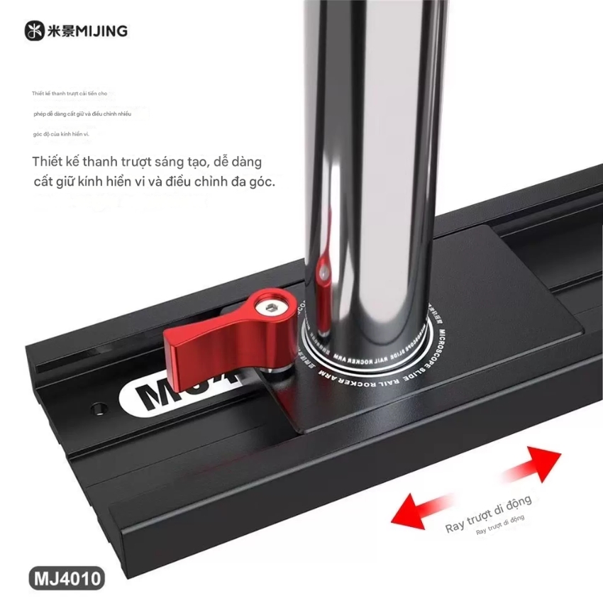 Ray trượt mượt mà: Khác với các tay arm cố định, MJ4010 tích hợp một thanh ray trượt (movable slide rail). Tính năng này cho phép đầu kính hiển vi di chuyển tịnh tiến tới lui một cách nhẹ nhàng, giúp thay đổi tiêu cự và vị trí làm việc mà không cần phải nhấc hay di dời cả bộ đế nặng nề.