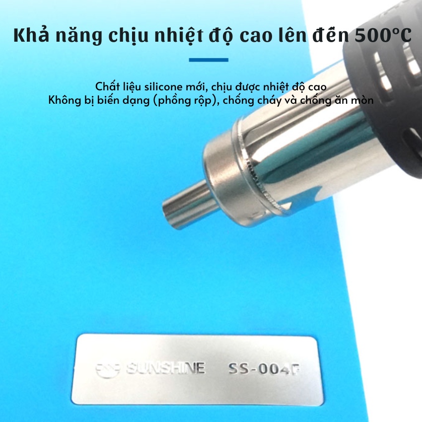Điểm ấn tượng nhất của Repair mat Sunshine SS-004F chính là khả năng chịu nhiệt độ cao lên đến 500°C. Được làm từ chất liệu silicone thế hệ mới, thảm không bị biến dạng, phồng rộp hay nóng chảy ngay cả khi tiếp trực tiếp với đầu khò nhiệt. Đặc tính chống cháy và chịu ăn mòn giúp sản phẩm có độ bền bỉ vượt trội theo thời gian, đảm bảo an toàn tuyệt đối cho bề mặt bàn làm việc của bạn.