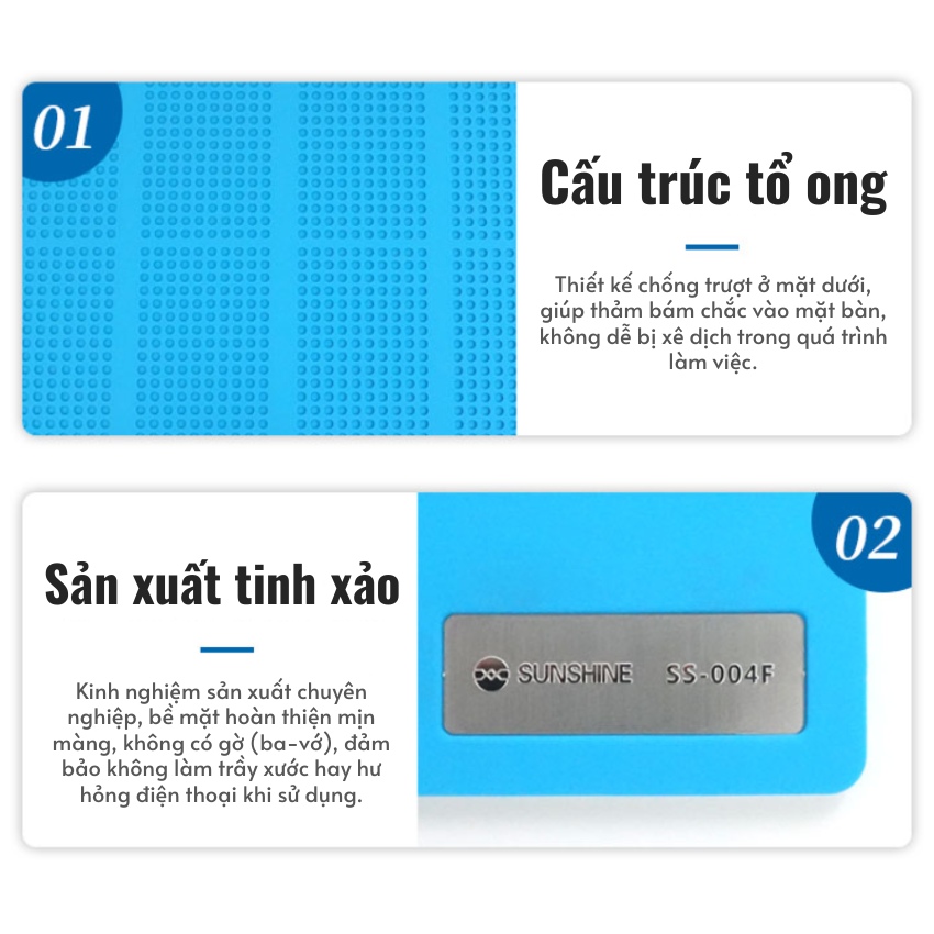 Mặt dưới của Repair mat Sunshine SS-004F được thiết kế theo cấu trúc tổ ong (Honeycomb structure). Đây là một cải tiến thông minh giúp thảm bám chắc vào mặt bàn, không bị xê dịch trong quá trình thao tác. Đồng thời, bề mặt phía trên được hoàn thiện mịn màng, không có gờ thừa (burrs), đảm bảo không gây hư hại cho thiết bị của khách hàng.
